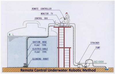 Underwater robotic inspection and cleaning works can be conducted without having to shut down the existing operating system. It is a cost effective and non man-entry inspection and cleaning method that can avoid potential water-born disease contamination, no disturbance to live system operation during cleaning process, and many advantages.